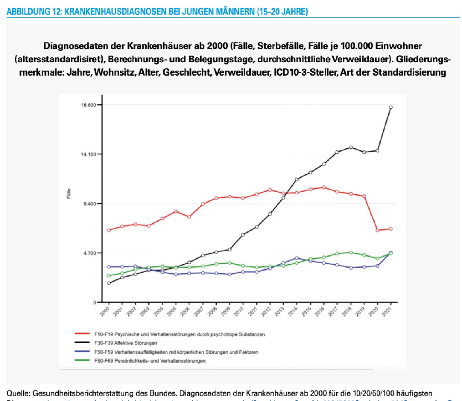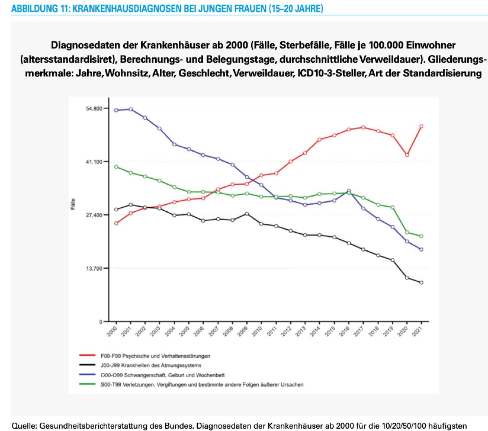 Die Diagnosedaten der Krankenhäuser ab 2000 dokumentieren auf der einen Seite, dass die hohe subjektive Selbsteinschätzung von depressiven Tendenzen auch gravierende Konsequenzen für die jungen Frauen hat. Denn seit 2000 sind die psychischen und Verhaltensstörungen zur häufigsten Diagnose dieser Altersgruppe geworden. Es wirft kein gutes Bild auf eine Gesellschaft, wenn eine signifikante Gruppe junge Erwachsene, hier junger Frauen, solche ernsthaften und häufig auch langfristig wirkenden Störungen aufweist. Insbesondere auch deswegen, weil die Entwicklung konträr zu Entwicklung bei den jungen Männern verläuft. Genauso irritierend ist allerdings auch die große Variation innerhalb der Bundesrepublik. Wir können hier keine Spekulationen und Vermutungen über die Ursachen dieser Entwicklung formulieren und wollen das auch gar nicht. Das ist Aufgabe der entsprechenden medizinischen Fächer. Aber solche kontinuierlichen Anstiege dokumentieren eben nicht nur medizinische Probleme.