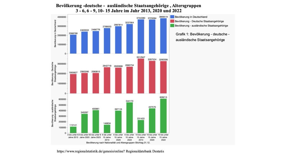 Die Zahl der Kinder bis zu 15 Jahren verändert sich zwischen 2013 und 2030 um circa 1 Million Kinder. Diese positive Entwicklung ist im wesentlichen Folge der Zuwanderung in dieser Zeit. Diese Kinder sind ein Geschenk für die Gesellschaft, weil ihre Talente und Kompetenzen, richtig qualifiziert, der Alterung dieser Gesellschaft entgegenwirken und die Gesellschaft bereichern. Leider hat die deutsche Bildungspolitik bis heute nicht begriffen, dass man für dieses Geschenk auch zusätzlich investieren muss. Im Grundschulbereichen finanziert Deutschland in Relationen zum Bruttoinlandsprodukt weniger als die meisten europäischen Länder.
