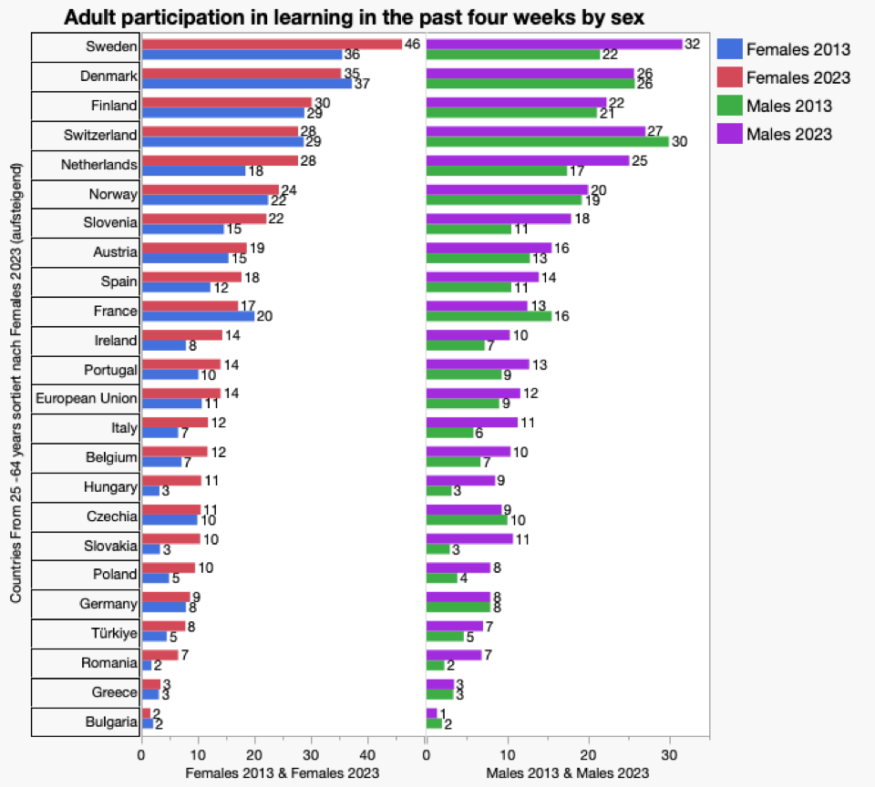 Deutschland, so zeigen die Daten von Eurostat, konnte die mittlere Position im europäischen Vergleich bei dem Nachhaltigkeitsziel 4, Bildung seit 2012 nicht halten. Entweder hat sich Deutschland in den Leistungsindikatoren verschlechtert, oder aber die anderen Länder haben in anderen Indikatoren sehr viel mehr zugelegt als Deutschland. Die Internetseite“ SDG4“ Eurostat gibt die Originaldaten und Einschätzungen der Europäischen Kommission und der europäischen Statistikbehörde wieder Die folgenden Grafiken dienen der Ergänzung und werden im Kapitel Deutschland, einen Bildungsnation im Abstieg erläutern.