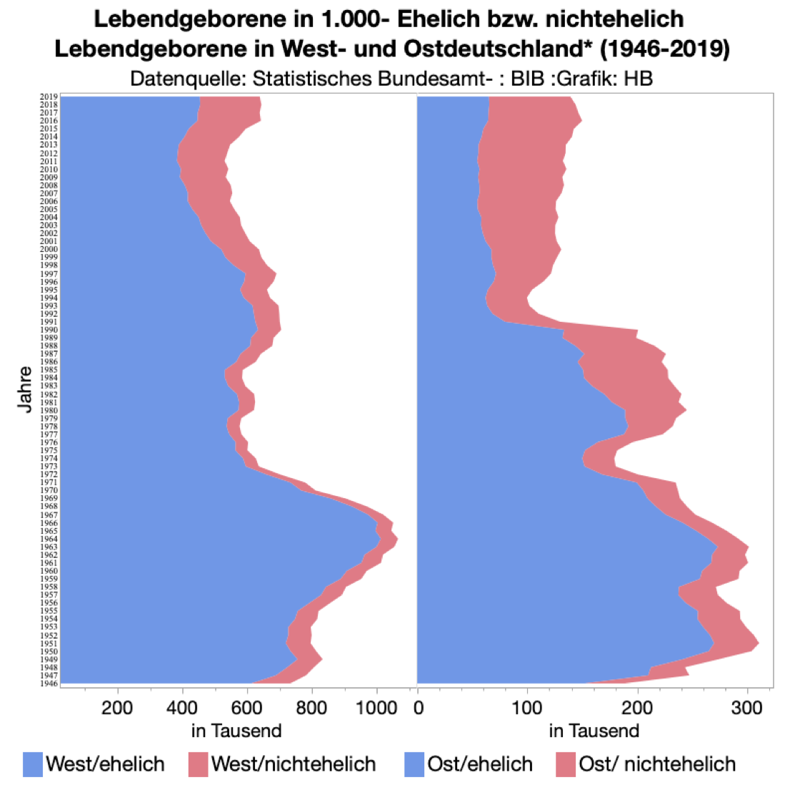 Bei den Lebensformen der Kinder sind zwei Tendenzen deutlich. Zu einem Leben in Westdeutschland sehr viel mehr Kinder mit beiden Eltern zusammen als in den neuen Bundesländern. Das dokumentiert sich auch in dem Unterschied eheliche und außerehelich Geburten.
