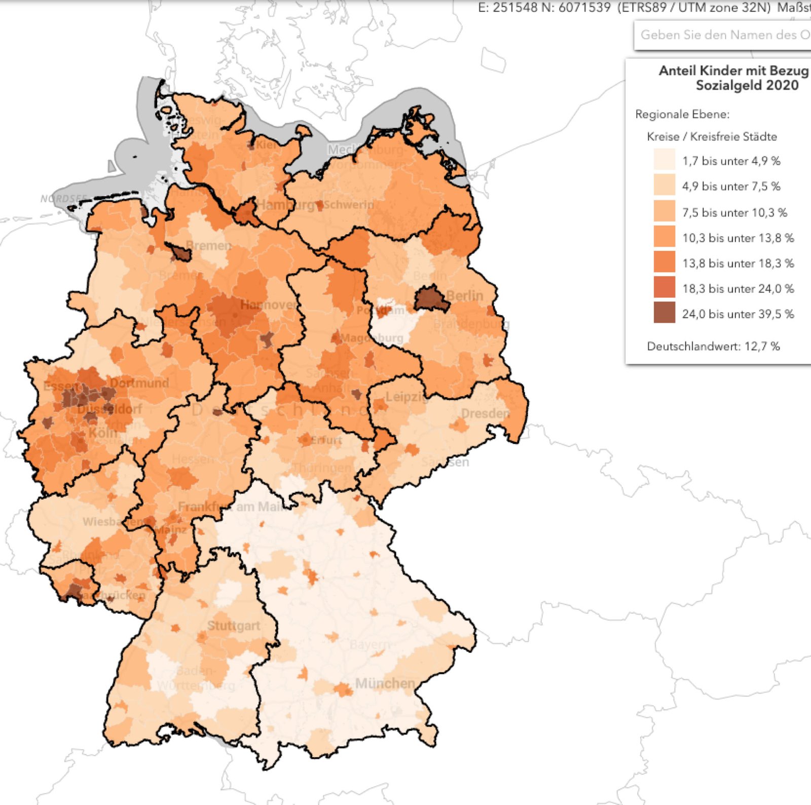 Die Daten der Bundesanstalt für Raumordnung machen auf Kreisebene deutlich, dass die auf europäischen Niveau gezeichnet Zusammenhänge in der gleichen Weise auch die Kreise in der Bundesrepublik Deutschland aus differenzieren. Eine hohe Beschäftigungsquote von Frauen und Müttern, eine hohe Beschäftigungsquote von Ausländern korrigiert fast perfekt mit geringer Kinderarmut, gemessen auf der Basis von Eurostat. zusätzlich wandern in diese Regionen auch noch Familien zu. D.h. die Lebensverhältnisse dort sind so attraktiv, dass Familien mit Kindern diese Regionen auch noch aufsuchen und somit die positiven Effekt zur Vermeidung von relativer Kinderarmut verstärken. Die Unterschiede zwischen diesen Kreisen, die fast ausschließlich in Bayern liegen und die Nord und Westdeutschen, Regionen und Kreisen mit hoher Kinderarmut geringer Frauen, Beschäftigung und geringer Beschäftigung von Ausländern sind teilweise extrem. Städte, Essen, Bremen oder Kiel weisen Armut,quoten von Kindern von 30 % auf, gegenüber 2-4 % bei denen Kreisen mit relativ geringer Kinderarmut. Die Beschäftigungsquote für Frauen liegen etwa in Bremen unter 50 %, und die Beschäftigung ausländischer Mitbürger bei gerade mal 35 %. Die Unterschiede in Deutschland zwischen den Kreisen sind in diesen Indikatoren noch ausgeprägter als zwischen europäischen Ländern.