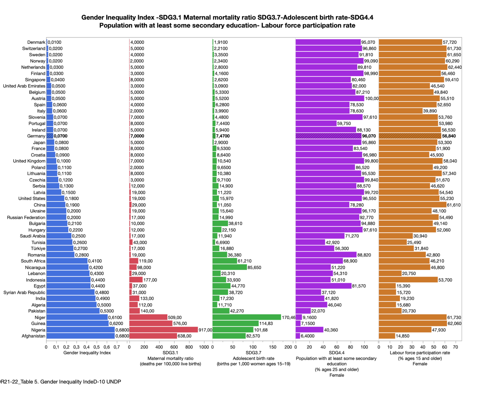 Auch wenn hier nur einige der Indikatoren des GII dargestellt sind, wird deutlich, dass Deutschland gegenüber anderen Ländern sowohl bei der Mütter Sterblichkeit, der Zahl der Ehen in sehr jugendlichen Alter und auch der Frau Erwerbsquote gegenüber anderen Ländern ein erheblichen Nachholbedarf hat. Deutlich wird aber auch, dass aus einer international Perspektive die Frage der Geschlechtergerechtigkeit, weltweit eine große politische, kulturelle und wirtschaftliche Herausforderung darstellt. Es wird auch deutlich, dass man nicht einfach Europa gegenüber anderen Regionen abgrenzen kann, sondern das arabische Länder in manchen Punkten mit europäischen Ländern gut mithalten können. Gleichzeitig wird aber auch deutlich, dass die Benachteiligung von Frauen in sehr unterschiedlichen Ländern und Regionen Auftritt und die Muster, hohe Mutter Sterblichkeit, ein hoher Anteil von Kinder, ihm, geringe Qualifikation, häufig verbunden mit geringer Erwerbstätigkeit, aber keinesfalls immer, Probleme deutlich machen, die es zu lösen gilt..