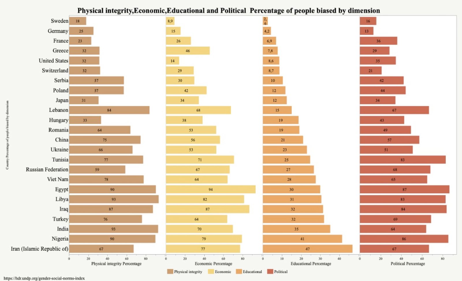 Es sind aber nicht nur die Männer, die bestimmte Vorbehalte oder Vorurteile haben. Gut 36 % der Frauen in Deutschland, ein geringer Wert im internationalen Vergleich, gegenüber 44 % bei den Männern haben zumindest bei einer der Dimensionen Vorbehalte gegenüber der Gleichheit von Mann und Frau. Das gilt weltweit, auch in den Ländern mit sehr hohen Vorbehalten. Und auch bei einem Land wie Deutschland mit relativ wenig Vorbehalten ist noch viel zu tun. Denn ohne Vorbehalte in allen Dimension sind in Deutschland etwa 60 %. Das ist zwar viel im Verhältnis zu Ländern wie Vietnam, Indien oder Tunesien, aber 40 Prozent haben ihm doch Vorbehalte.