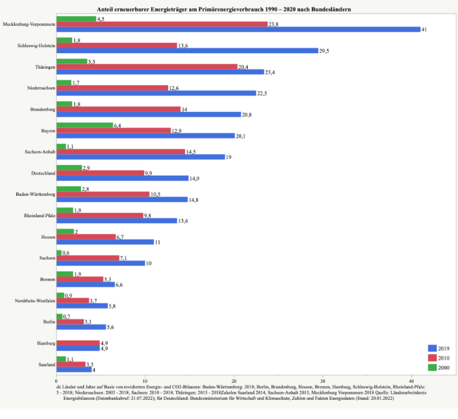 Vergleicht man den Anteil erneuerbare Energien an den Primärenergieverbrauch in den einzelnen Bundesländern pro Kopf der Bevölkerung, sieht man seit 1990, aber auch beeindruckende Fortschritte in den einzelnen Bundesländern. Am Beispiel von Brandenburg kann man aber auch gut verdeutlichen, das alternative Energiequellen nicht ohne weiteres ein Ersatz für Kohle darstellen. Brandenburg inzwischen ein sehr wichtiger Energieproduzent in Deutschland produziert sowohl alternative Energien durch Windkraft wie aber eben auch Energien auf der Basis von Braunkohle. Die Grafik zeigt aber auch sehr schön, dass bestimmte Energiequellen wie etwa die Windenergie Standortabhängig ist. So sind Mecklenburg-Vorpommern und Schleswig-Holstein bezogen auf den Kopf der Bevölkerung die Bundesländer mit dem stärksten Anteil alternative Energien.