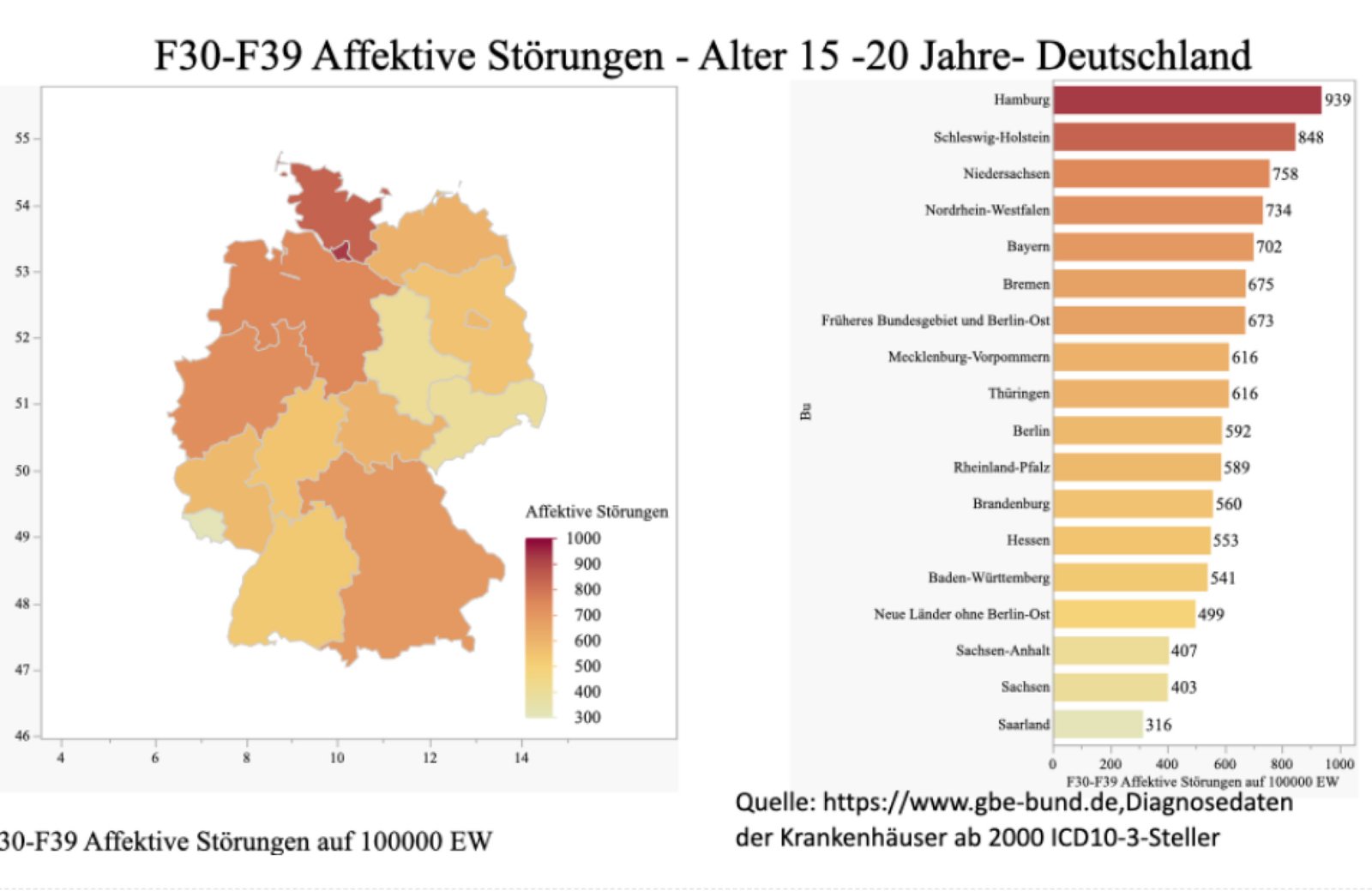 Die Diagnosedaten der Krankenhäuser ab 2000 dokumentieren auf der einen Seite, dass die hohe subjektive Selbsteinschätzung von depressiven Tendenzen auch gravierende Konsequenzen für die jungen Frauen hat. Denn seit 2000 sind die psychischen und Verhaltensstörungen zur häufigsten Diagnose dieser Altersgruppe geworden. Es wirft kein gutes Bild auf eine Gesellschaft, wenn eine signifikante Gruppe junge Erwachsene, hier junger Frauen, solche ernsthaften und häufig auch langfristig wirkenden Störungen aufweist. Insbesondere auch deswegen, weil die Entwicklung konträr zu Entwicklung bei den jungen Männern verläuft. Genauso irritierend ist allerdings auch die große Variation innerhalb der Bundesrepublik. Wir können hier keine Spekulationen und Vermutungen über die Ursachen dieser Entwicklung formulieren und wollen das auch gar nicht. Das ist Aufgabe der entsprechenden medizinischen Fächer. Aber solche kontinuierlichen Anstiege dokumentieren eben nicht nur medizinische Probleme.