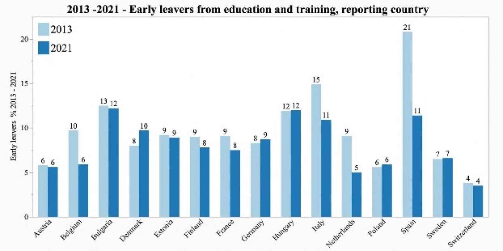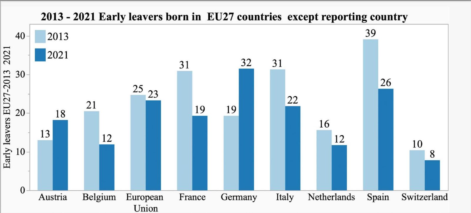 Bei Kindern, die in Deutschland geboren wurden, verlassen etwa 9 % die Schule oder Abschluss. In der Schweiz sind es nur 4 %, in Österreich 6 %, den Niederlanden 5 %. Die meisten Länder haben sich verbessert, teilweise deutlich, Deutschland schafft es selbst bei den Kindern aus dem Herkunftsland nur in das hintere Drittel.