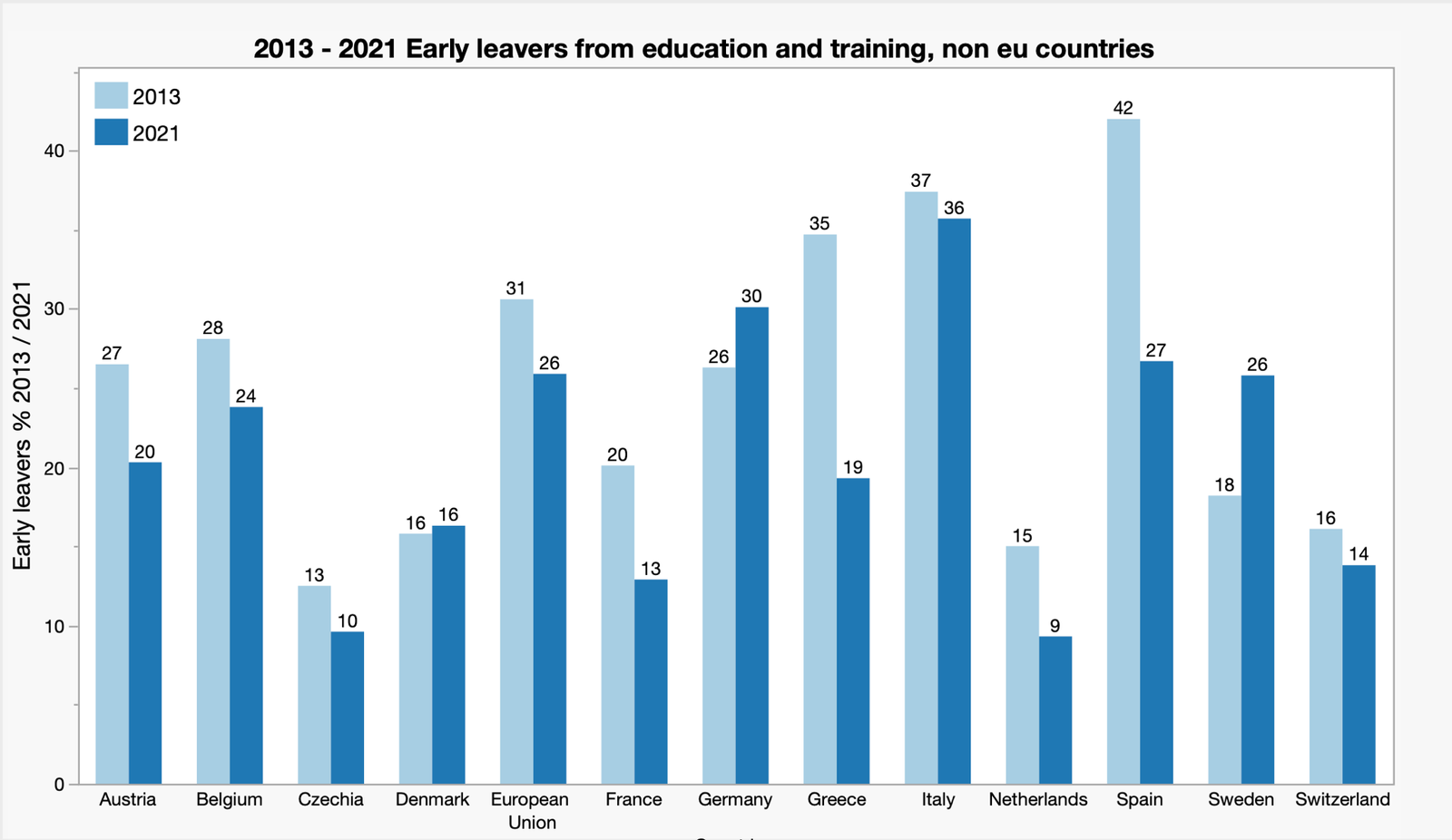 Noch schlechter als Deutschland ist hier Italien mit 36 %,. Aber die Schweiz mit nur 14 % ,Österreich mit 20 % und die Niederlanden mit 9 % zeigen sehr deutlich, dass die hohen Quoten nicht an den Kindern liegen können. Denn die Schweiz hat ein ähnlich hohen Ausländeranteil wie Deutschland und auch die Niederlande. Man kann es drehen und wenden, wie man will, es ist ein Versagen der Schule. Denn das doppelt oder dreimal so viele Kinder in Deutschland aus nichteuropäischen Ländern scheitern und das auch noch genauso viele sind wie aus europäischen Ländern ist jedenfalls im europäischen Vergleich ein Schulversagen. Solange die Zahlen so bleiben, ist das Gejammere wegen des Facharbeitermangels ziemlich unglaubwürdig.