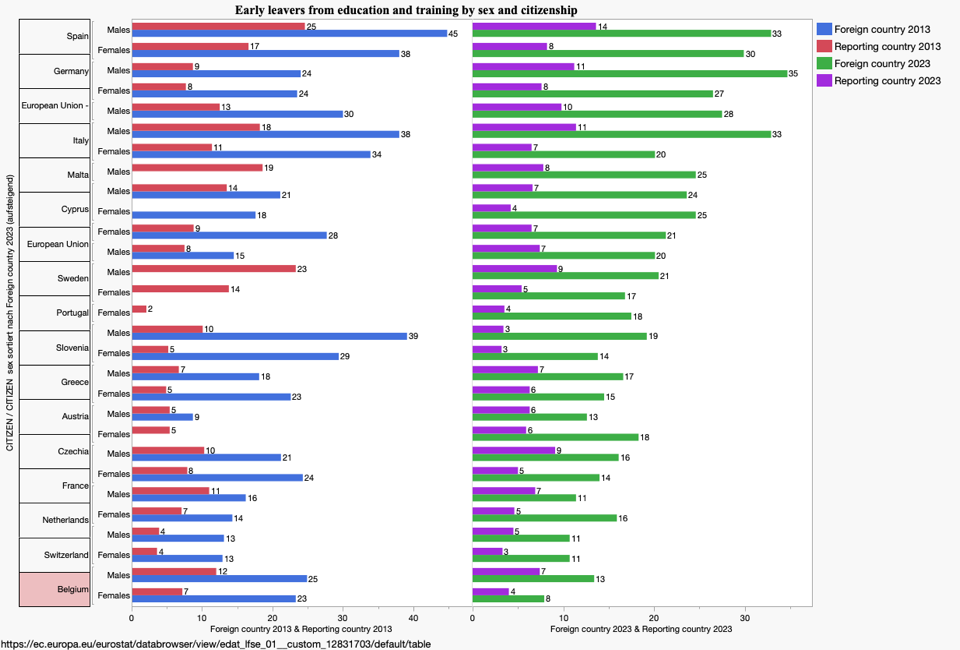 Deutschland, so zeigen die Daten von Eurostat, konnte die mittlere Position im europäischen Vergleich bei dem Nachhaltigkeitsziel 4, Bildung seit 2012 nicht halten. Entweder hat sich Deutschland in den Leistungsindikatoren verschlechtert, oder aber die anderen Länder haben in anderen Indikatoren sehr viel mehr zugelegt als Deutschland. Die Internetseite“ SDG4“ Eurostat gibt die Originaldaten und Einschätzungen der Europäischen Kommission und der europäischen Statistikbehörde wieder Die folgenden Grafiken dienen der Ergänzung und werden im Kapitel Deutschland, einen Bildungsnation im Abstieg erläutern.
