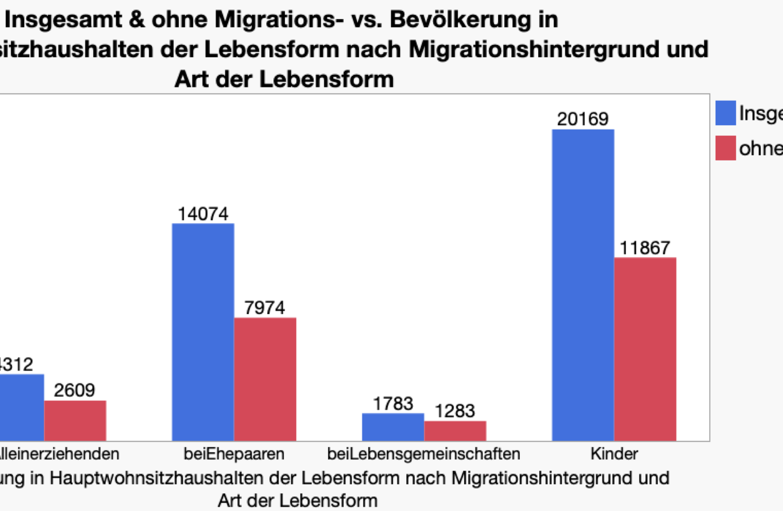 Die zweite wichtige Tendenz bei ist, dass von den 20 Millionen Kindern, etwa 9 Millionen Kinder, Eltern mit Migrationshintergrund oder Eltern haben, die in dem Ausland geboren worden sind. Bei den allein erziehenden Eltern und den Lebensgemeinschaften ist die Gruppe der Eltern mit Migrationshintergrund deutlich starker vertreten als Eltern ohne Migrationshintergrund.