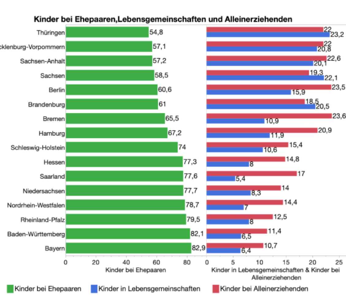 Bei den Lebensformen der Kinder sind zwei Tendenzen deutlich. Zu einem Leben in Westdeutschland sehr viel mehr Kinder mit beiden Eltern zusammen als in den neuen Bundesländern. Das dokumentiert sich auch in dem Unterschied eheliche und außerehelich Geburten.