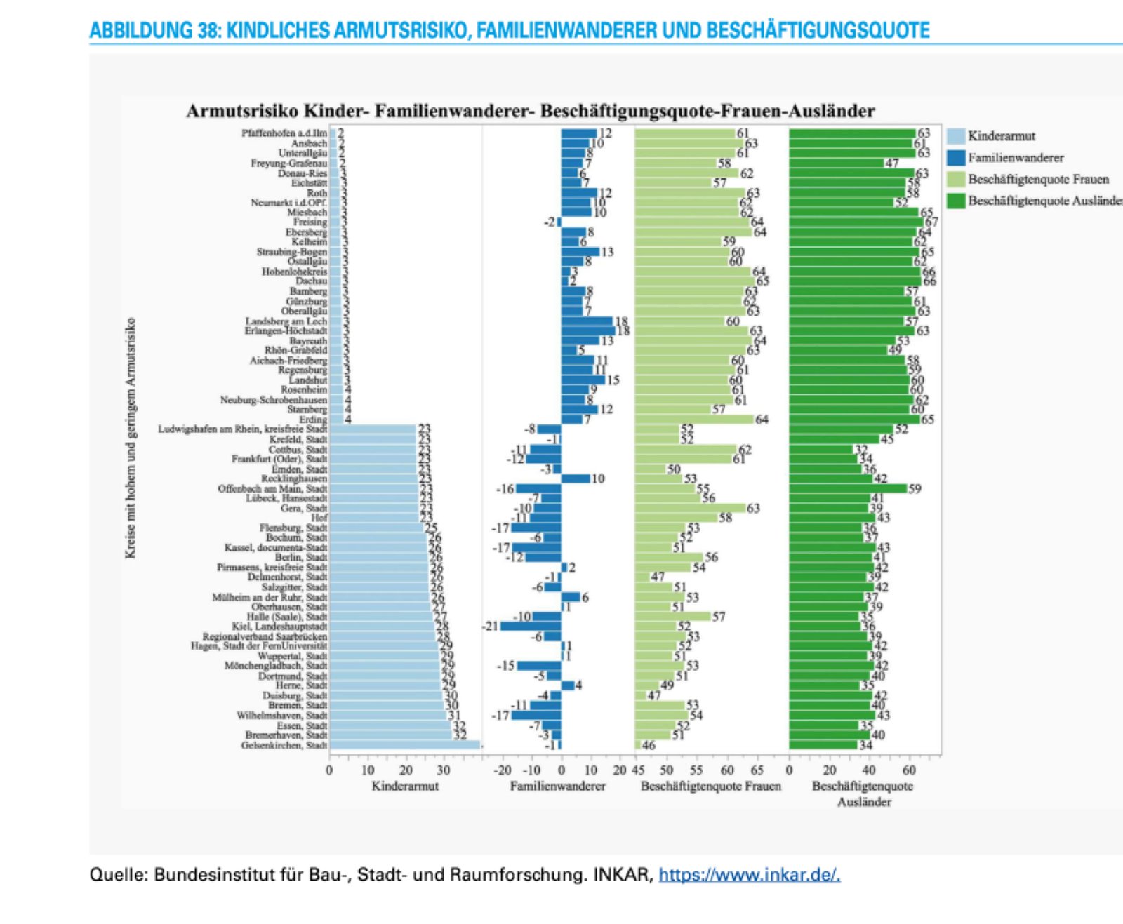 Die Daten der Bundesanstalt für Raumordnung machen auf Kreisebene deutlich, dass die auf europäischen Niveau gezeichnet Zusammenhänge in der gleichen Weise auch die Kreise in der Bundesrepublik Deutschland aus differenzieren. Eine hohe Beschäftigungsquote von Frauen und Müttern, eine hohe Beschäftigungsquote von Ausländern korrigiert fast perfekt mit geringer Kinderarmut, gemessen auf der Basis von Eurostat. zusätzlich wandern in diese Regionen auch noch Familien zu. D.h. die Lebensverhältnisse dort sind so attraktiv, dass Familien mit Kindern diese Regionen auch noch aufsuchen und somit die positiven Effekt zur Vermeidung von relativer Kinderarmut verstärken. Die Unterschiede zwischen diesen Kreisen, die fast ausschließlich in Bayern liegen und die Nord und Westdeutschen, Regionen und Kreisen mit hoher Kinderarmut geringer Frauen, Beschäftigung und geringer Beschäftigung von Ausländern sind teilweise extrem. Städte, Essen, Bremen oder Kiel weisen Armut,quoten von Kindern von 30 % auf, gegenüber 2-4 % bei denen Kreisen mit relativ geringer Kinderarmut. Die Beschäftigungsquote für Frauen liegen etwa in Bremen unter 50 %, und die Beschäftigung ausländischer Mitbürger bei gerade mal 35 %. Die Unterschiede in Deutschland zwischen den Kreisen sind in diesen Indikatoren noch ausgeprägter als zwischen europäischen Ländern.