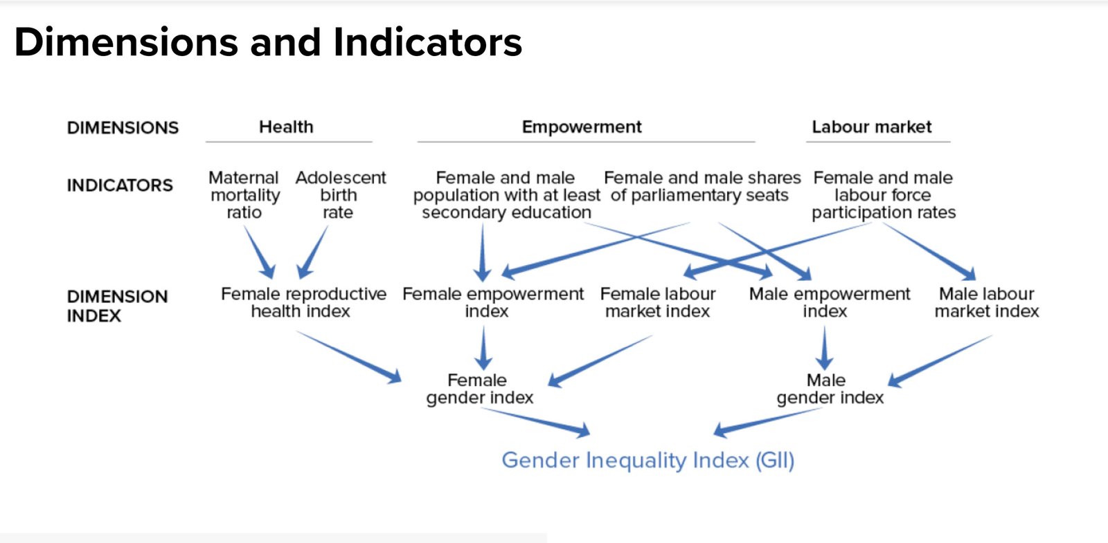 Der GDI misst geschlechtsspezifische Leistungsunterschiede in drei grundlegenden Dimensionen der menschlichen Entwicklung: Gesundheit, gemessen an der Lebenserwartung von Frauen und Männern bei der Geburt; Bildung, gemessen an den erwarteten Schuljahren von Frauen und Männern für Kinder und an den durchschnittlichen Schuljahren von Frauen und Männern für Erwachsene ab 25 Jahren; und Verfügungsgewalt über wirtschaftliche Ressourcen, gemessen am geschätzten Arbeitseinkommen von Frauen und Männern.