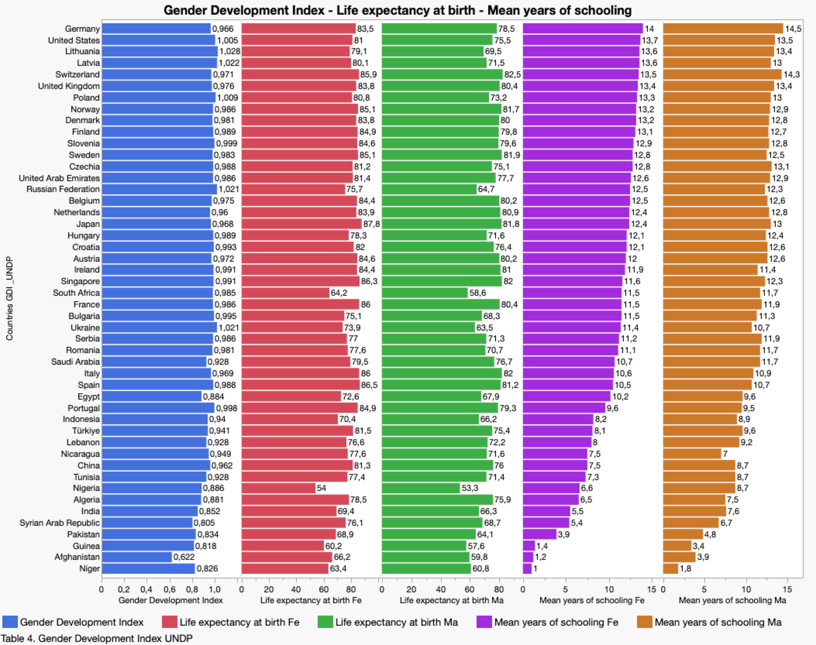 Auch wenn hier nur einige der Indikatoren des GII dargestellt sind, wird deutlich, dass Deutschland gegenüber anderen Ländern sowohl bei der Mütter Sterblichkeit, der Zahl der Ehen in sehr jugendlichen Alter und auch der Frau Erwerbsquote gegenüber anderen Ländern ein erheblichen Nachholbedarf hat. Deutlich wird aber auch, dass aus einer international Perspektive die Frage der Geschlechtergerechtigkeit, weltweit eine große politische, kulturelle und wirtschaftliche Herausforderung darstellt. Es wird auch deutlich, dass man nicht einfach Europa gegenüber anderen Regionen abgrenzen kann, sondern das arabische Länder in manchen Punkten mit europäischen Ländern gut mithalten können. Gleichzeitig wird aber auch deutlich, dass die Benachteiligung von Frauen in sehr unterschiedlichen Ländern und Regionen Auftritt und die Muster, hohe Mutter Sterblichkeit, ein hoher Anteil von Kinder, ihm, geringe Qualifikation, häufig verbunden mit geringer Erwerbstätigkeit, aber keinesfalls immer, Probleme deutlich machen, die es zu lösen gilt..