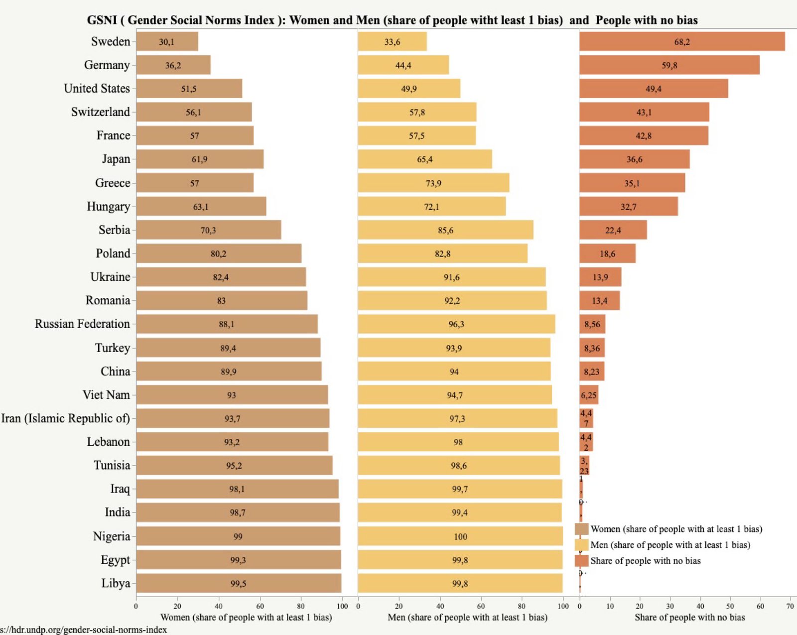 Es sind aber nicht nur die Männer, die bestimmte Vorbehalte oder Vorurteile haben. Gut 36 % der Frauen in Deutschland, ein geringer Wert im internationalen Vergleich, gegenüber 44 % bei den Männern haben zumindest bei einer der Dimensionen Vorbehalte gegenüber der Gleichheit von Mann und Frau. Das gilt weltweit, auch in den Ländern mit sehr hohen Vorbehalten. Und auch bei einem Land wie Deutschland mit relativ wenig Vorbehalten ist noch viel zu tun. Denn ohne Vorbehalte in allen Dimension sind in Deutschland etwa 60 %. Das ist zwar viel im Verhältnis zu Ländern wie Vietnam, Indien oder Tunesien, aber 40 Prozent haben ihm doch Vorbehalte.