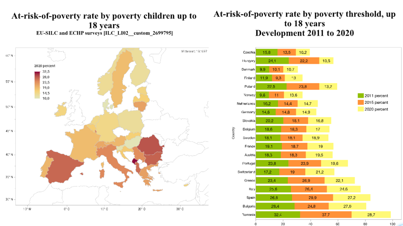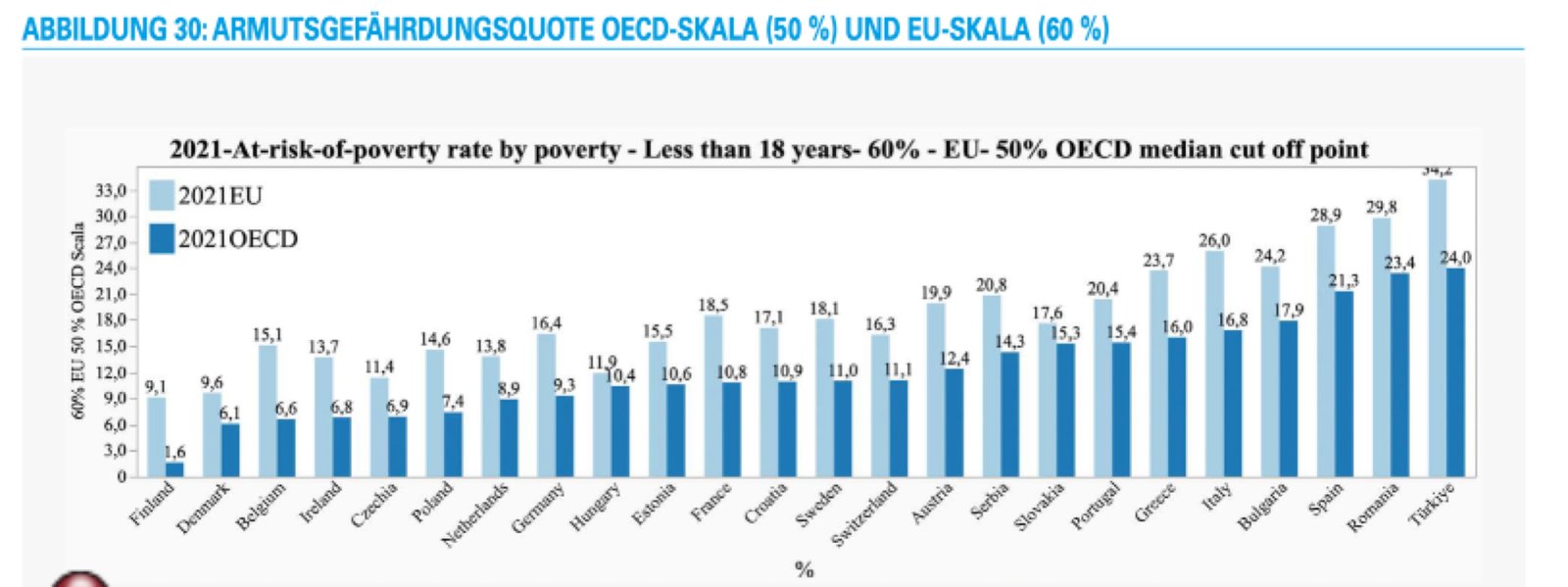 Auch unter deiner historische Perspektive liegt die relative ökonomische Kinderarmut in Deutschland im vorderen Drittel der europäischen Länder. Die Zeitreise bis 2021, danach wurde die Berechnungmethode etwas geändert, zeigen für Deutschland zwischen 14 und 15 % relative ökonomische Kinderarmut.