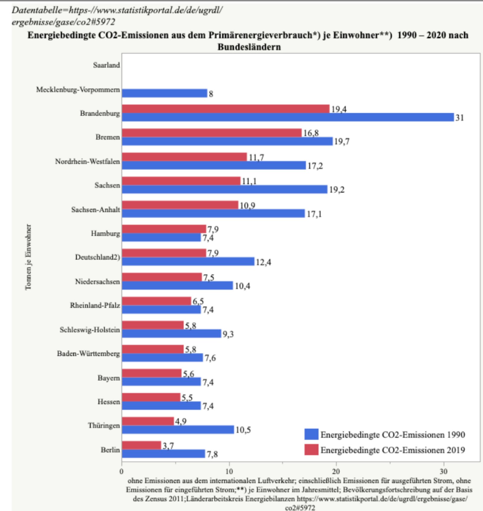 Die energiebedingten CO2 Missionen je Einwohner nach Bundesländern unterscheiden sich deutlich voneinander.