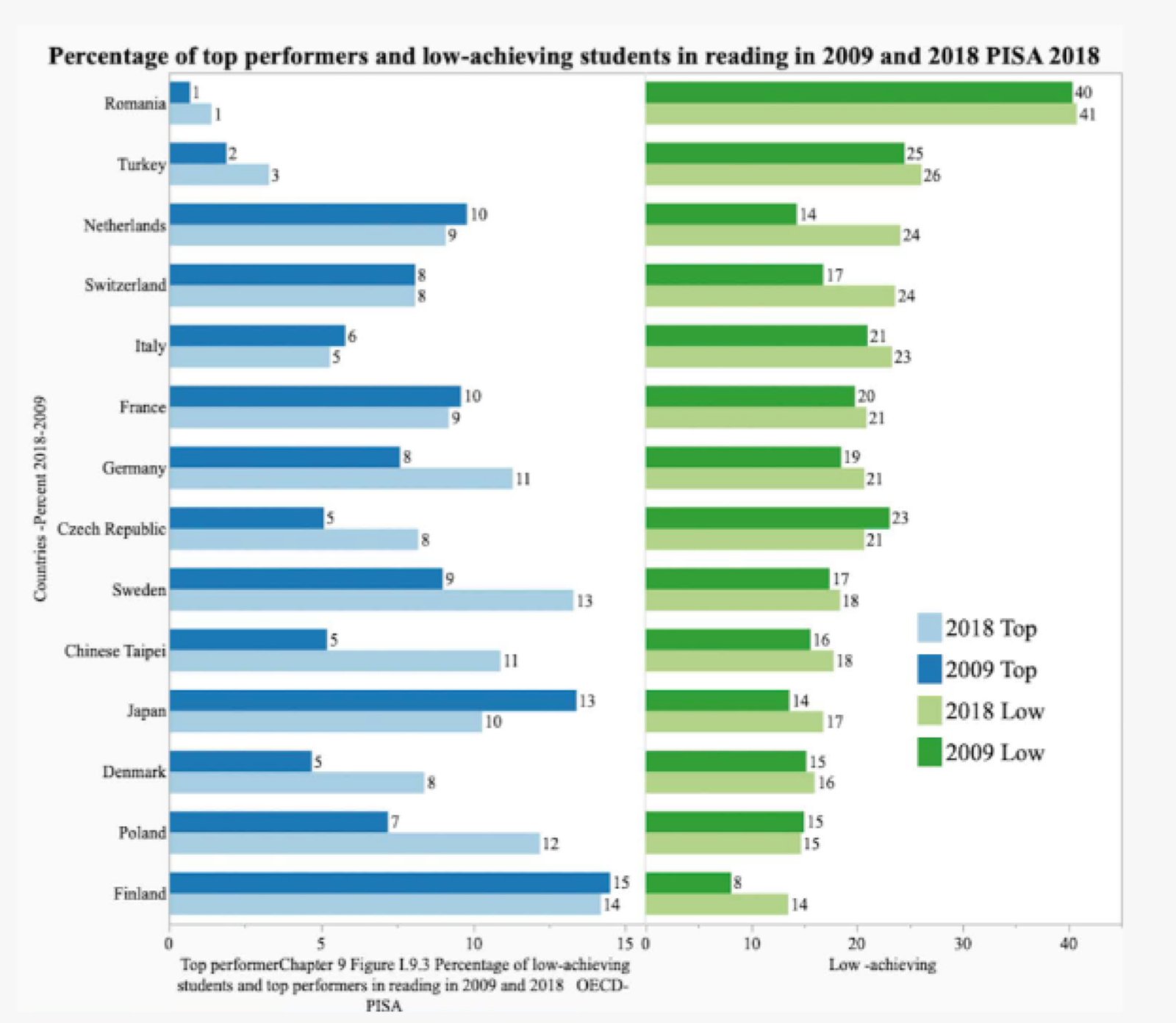 Quelle: OECD. PISA 2018 Results (Volume I). Figure I.9.3 Percentage of low-achieving students and top performers in reading in 2009 and 2018,
