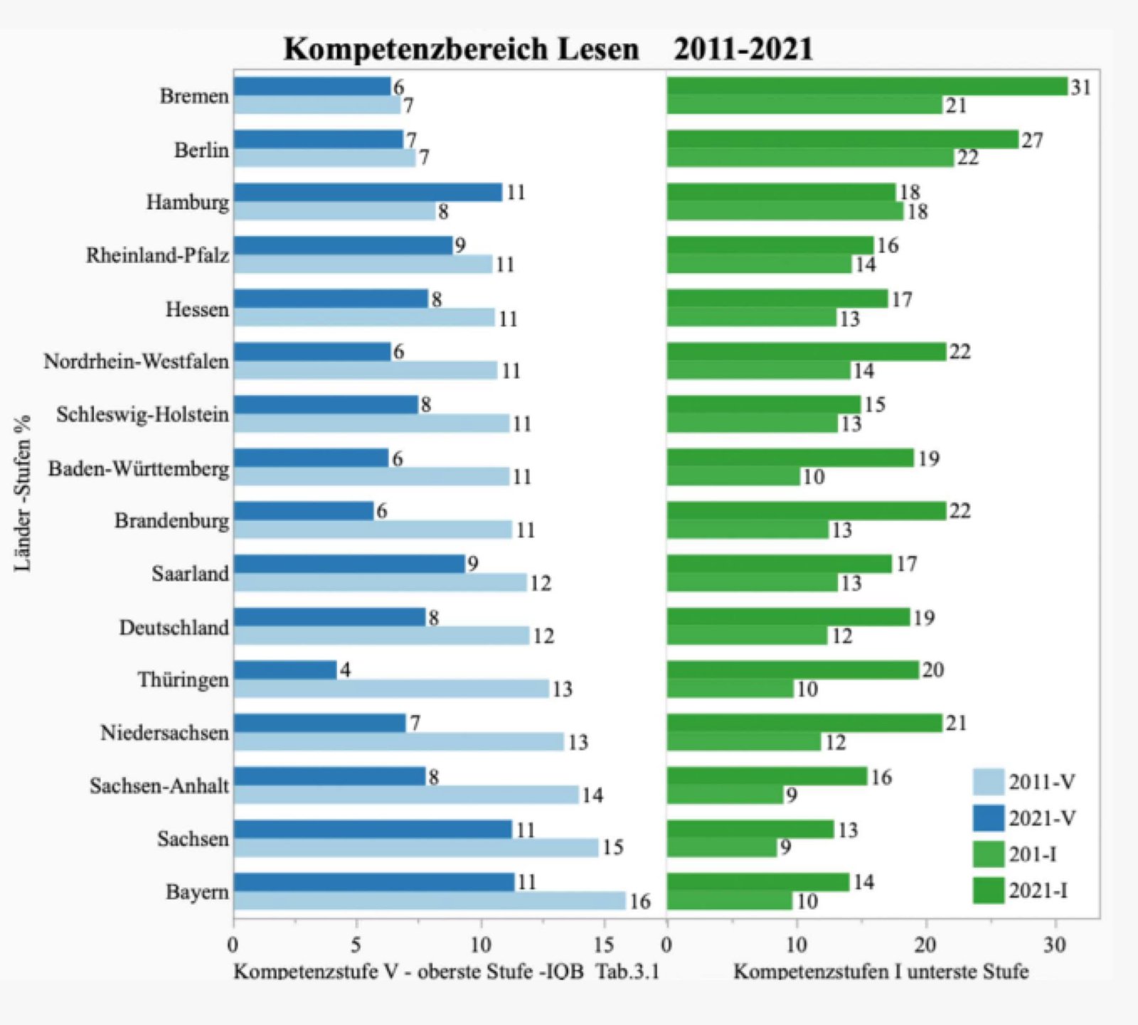 Die Grafik vergleicht die Ergebnisse der IQB-Studie von 2011 und 2021, die die Lesekompetenz von Viertklässlern in den Bundesländern misst