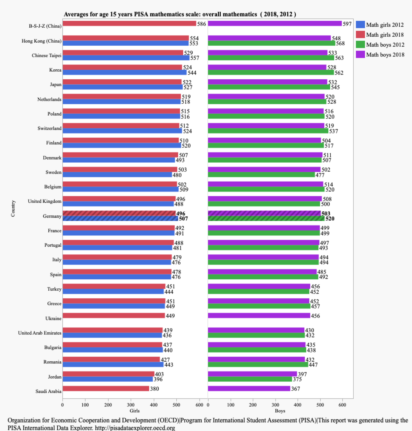 Die internationalen Vergleiche der OECD (Pisa) machen sehr deutlich, dass die Kinder in Deutschland zwischen 2012 und 2018 in Mathematik Leistungsverluste zeigen. Das gilt für die Jungen wie für die Mädchen. Kindern in anderen Ländern, etwa Polen oder den Niederlanden haben auch Verluste erlitten, aber sehr viel weniger Leistungeinbrüche zu verzeichnen wie Deutschland. Jungen in Deutschland, können sich mit Jungen aus China kaum in ihrer Leistungsfähigkeit vergleichen. Das sind aber auf dem Weltmarkt die schärfsten Konkurrenten in vielen technologischen Bereichen.