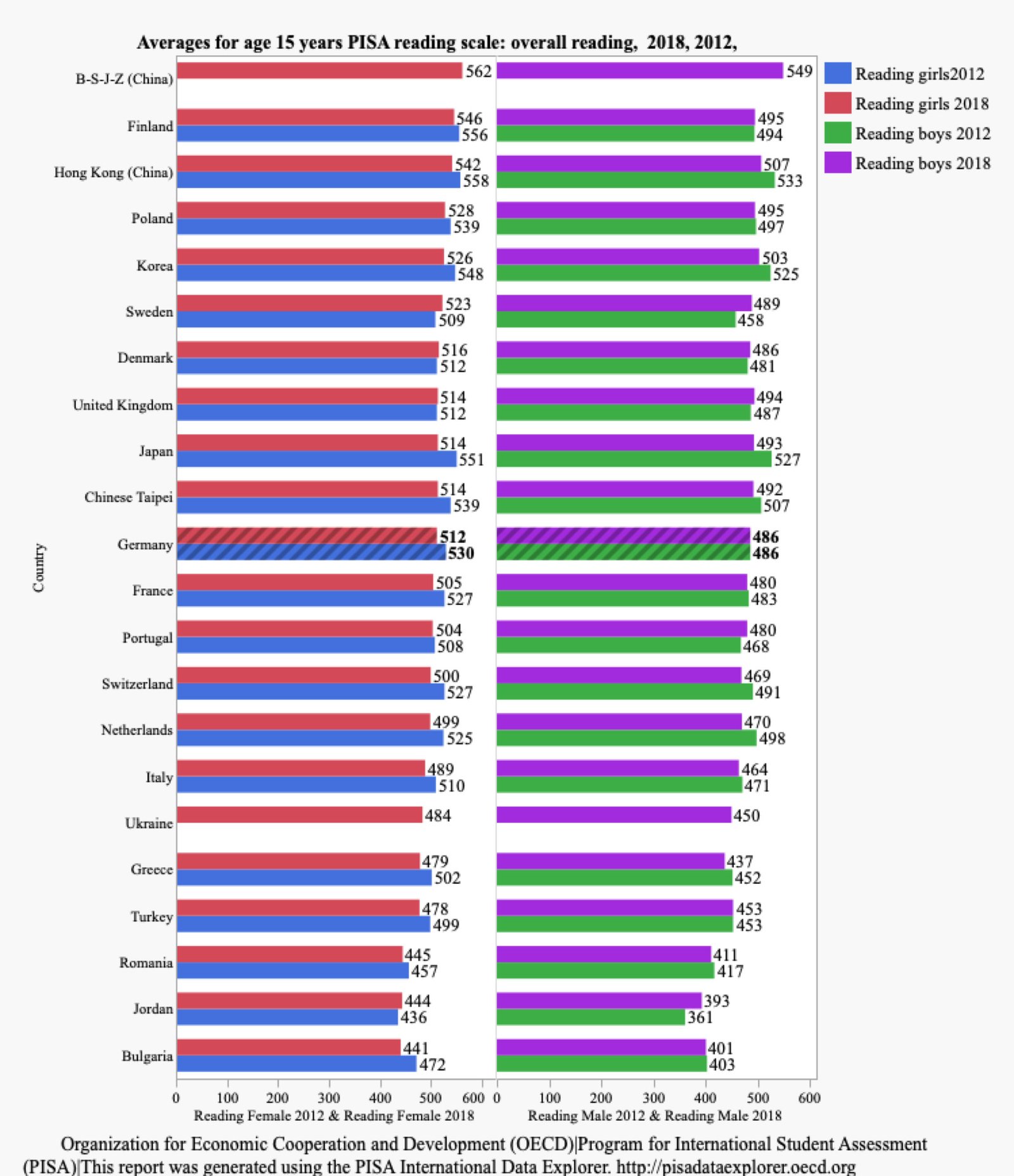 Das gleiche muss man auch beim Lesen festellen. Chinesische Mädchen, aber auch finnisch und polnische Mädchen, lesen sehr viel besser als ihre deutschen Altersgenossinnen. Da Mädchen in der Regel nicht nur in Deutschland, sondern auch in den meisten anderen Ländern besser lesen. als Jungen, gilt diese Aussage auch für Jungen, allerdings auf einem etwas niedrigem Niveau.